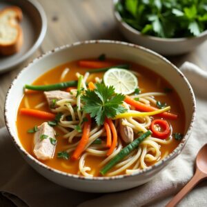 Healing Bowls: Ginger Chicken Noodle Soup with Veggies is a timeless culinary embrace designed to soothe the soul and rejuvenate the body. Rooted in traditional healing practices across cultures, this soup highlights the invigorating essence of fresh ginger, blending it seamlessly with tender chicken and vibrant garden-fresh vegetables to create a bowl full of warmth, flavor, and nourishment. Whether you’re recovering from a cold or simply craving comforting wellness food, this recipe invites you to simmer love and health in every spoonful.