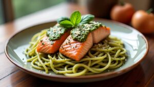 Savory Symphony: Pasta with Pesto and Salmon Delight captures the essence of Italian coastal cuisine, where fresh herbs and ocean flavors dance in perfect harmony. This recipe celebrates the vibrant, aromatic punch of homemade pesto paired with flaky, tender salmon and al dente pasta, designed to awaken your palate and elevate your dinner table experience into an unforgettable feast.