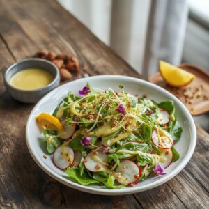 - Dress the salad: Pour the yuzu dressing over the salad mixture just before serving. Toss lightly to coat all ingredients without bruising the delicate leaves and radishes.