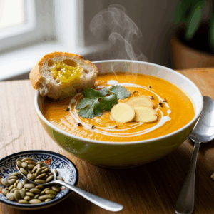 serve this zesty carrot ginger soup in deep bowls, drizzled with a swirl of creamy coconut milk or a light yogurt for contrast. Sprinkle with crunchy toasted pumpkin seeds or roasted chickpeas for texture, and finish with fresh herbs like cilantro or parsley to add a burst of color and freshness.